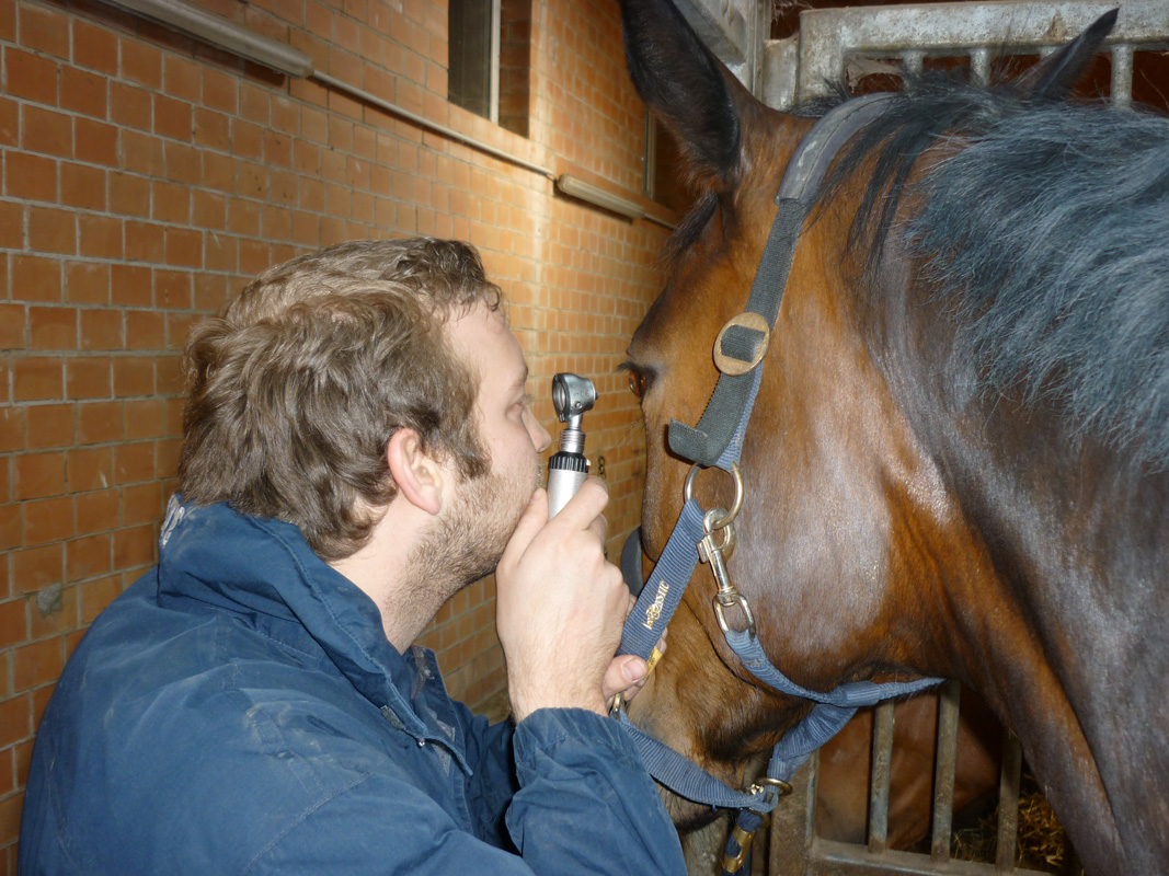 Im Anschluss an die Beugeproben wird ein so genannter Belastungstest durchgeführt. Das Pferd wird hierfür unter dem Reiter oder an der Longe bewegt und hierbei erneut begutachtet. Hiernach werden im Abstand von einigen Minuten zweimal die Atmungs- und Pulsfrequenz überprüft. Dabei testet der Tierarzt die Auswirkungen der Belastung auf Herz/Kreislauf und Atmung und darauf folgend die Dauer, die das Pferd benötigt, um zu den an vorheriger Stelle festgestellten Normalwerten zurückzufinden. Dadurch lässt sich eruieren, in welcher konditionellen Verfassung das Pferd sich befindet, und ob eventuelle Anzeichen für eine Beeinträchtigung des Atmungs- bzw. Herz/Kreislaufapparates vorliegen. Den Abschluss der klinischen Untersuchung bildet die Inspektion der Maulhöhle mit einem Maulgatter und schließlich die Augenuntersuchung, welche in einem verdunkelten Raum und unter Zuhilfenahme eines Ophthalmoskopes stattfinden sollte. Das Opthalmoskop ermöglicht durch Vergrößerung und die unmittelbar auf das Pferdeauge gerichtete Lichtquelle eine genauere Untersuchung des Augenhintergrundes, was mit bloßem menschlichem Auge nur sehr begrenzt möglich wäre.